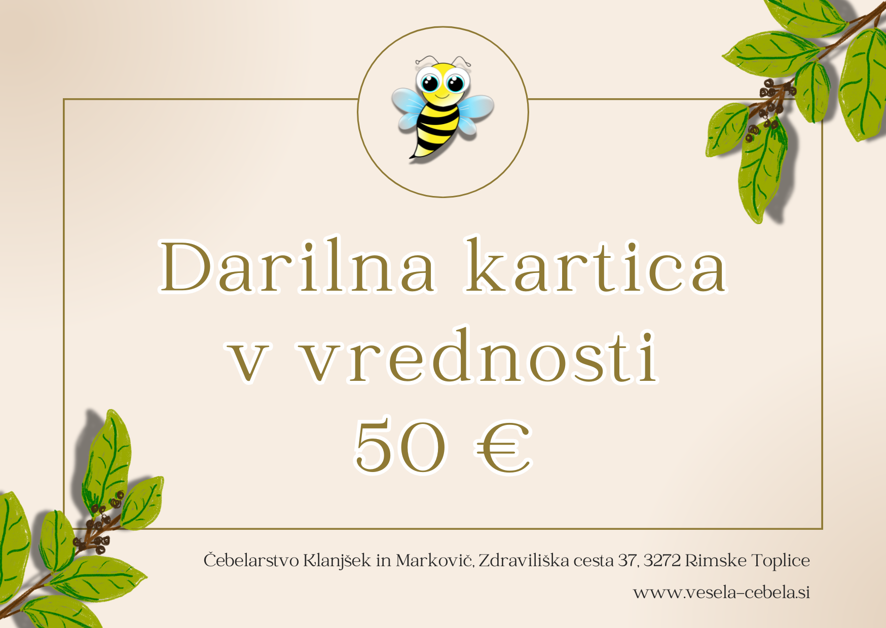 Podarite darilo, ki diši po naravi. Z darilno kartico vesele čebele svojim najdražjim omogočite, da si sami izberejo darilo med našimi pristnimi čebeljimi proizvodi. Naj bo to organski med, medenjaki ali kaj drugega iz čebeljega panja. Naj si izberejo nekaj, kar jim bo polepšalo dan in jih povezalo z naravo.